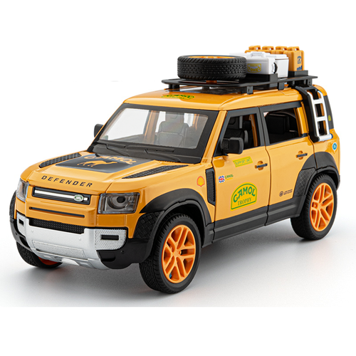 Beleying 1:24 Die-Cast Alloy Model - Compatible with Land Rover Defender - Gulf Oil / Camel Trophy Limited Edition with Roof Rack, Opening Doors, Sound & Light, Pull-Back Action & Shock Absorption
